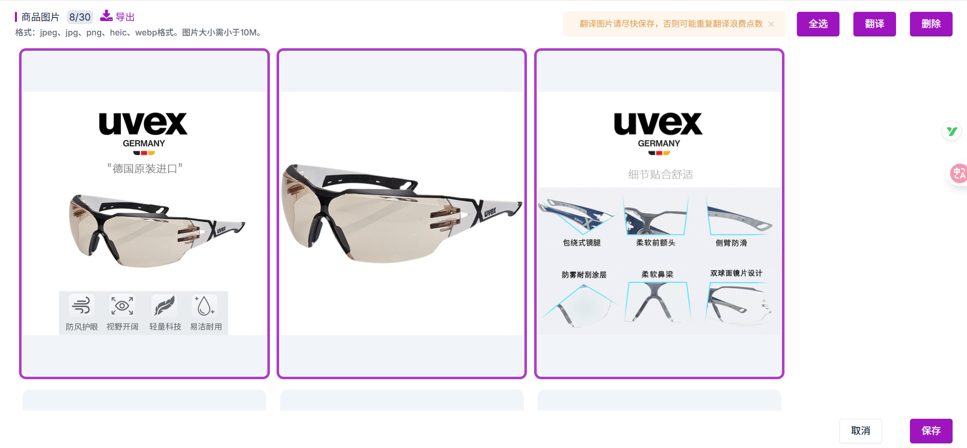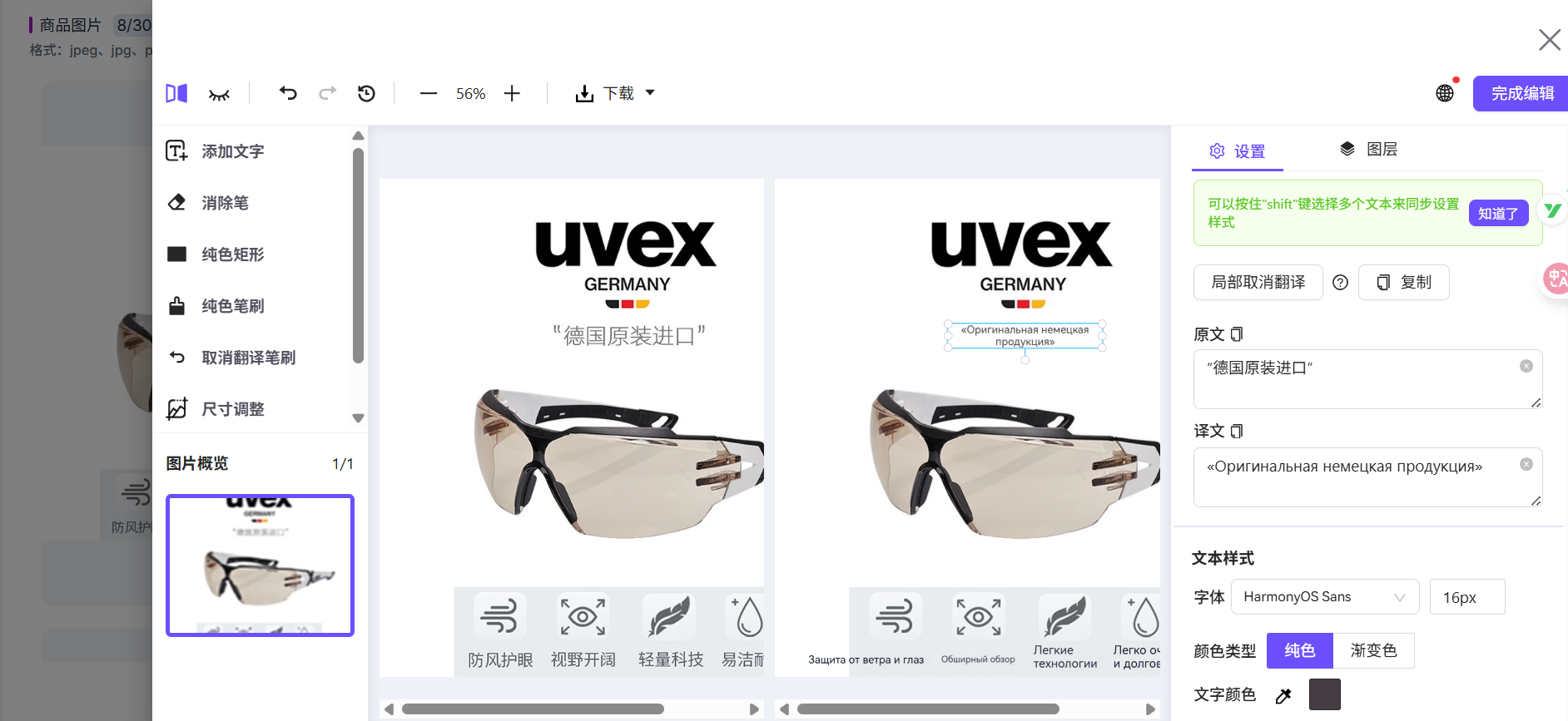 AI翻译后还可以进行手动微调(字体、大小、位置、颜色、本地化表达等),让图片看起来更符合俄罗斯消费者视觉习惯,避免被平台判定为复制图。