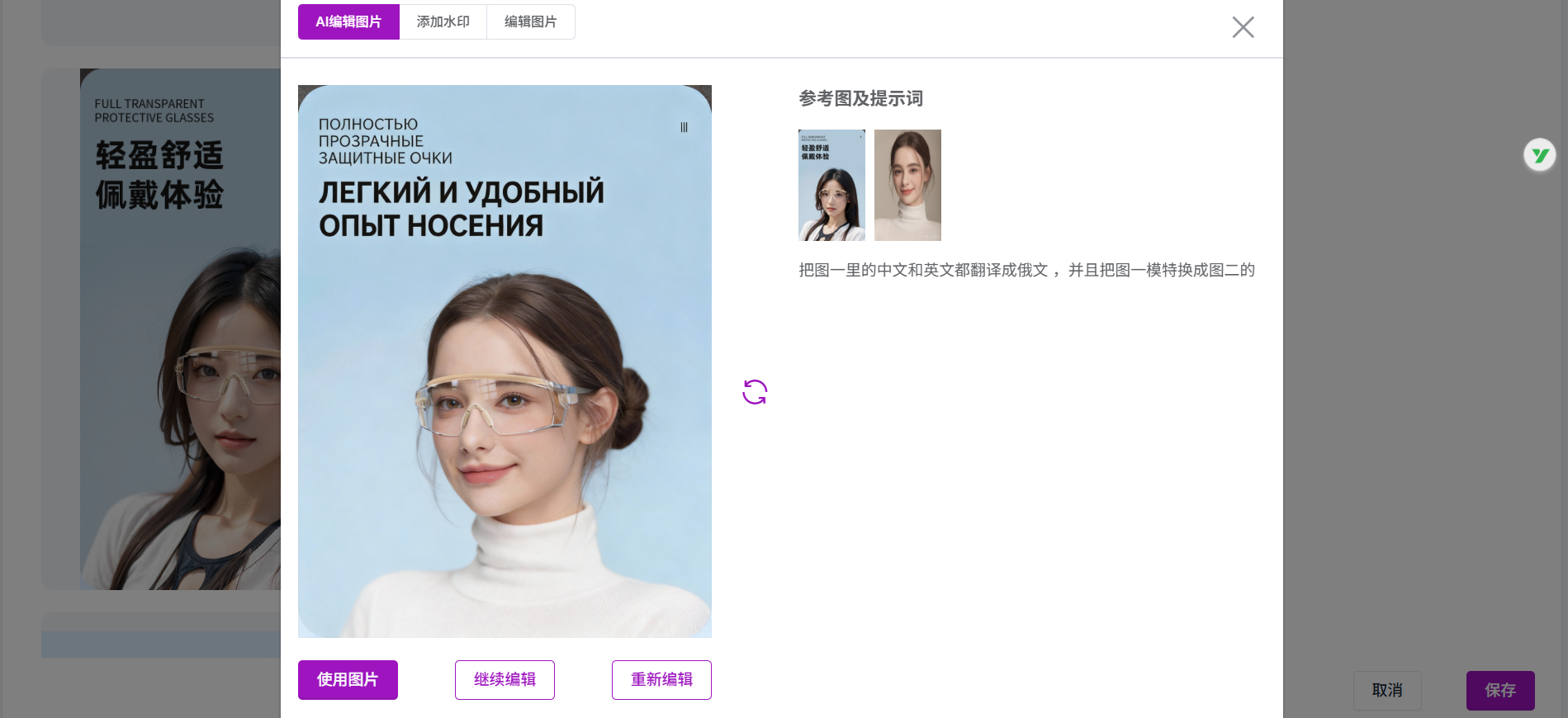 在往期文章中,我们介绍了如何利用工具识别并将商品图片中的中文文字快速翻译成俄语,让图片本地化更快更准确。现在,这套功能又升级了:新增AI图片编辑功能。你不仅可以翻译,还可以根据描述和参考图让AI自动修改或生成图片,大大提升采集上品效率。
