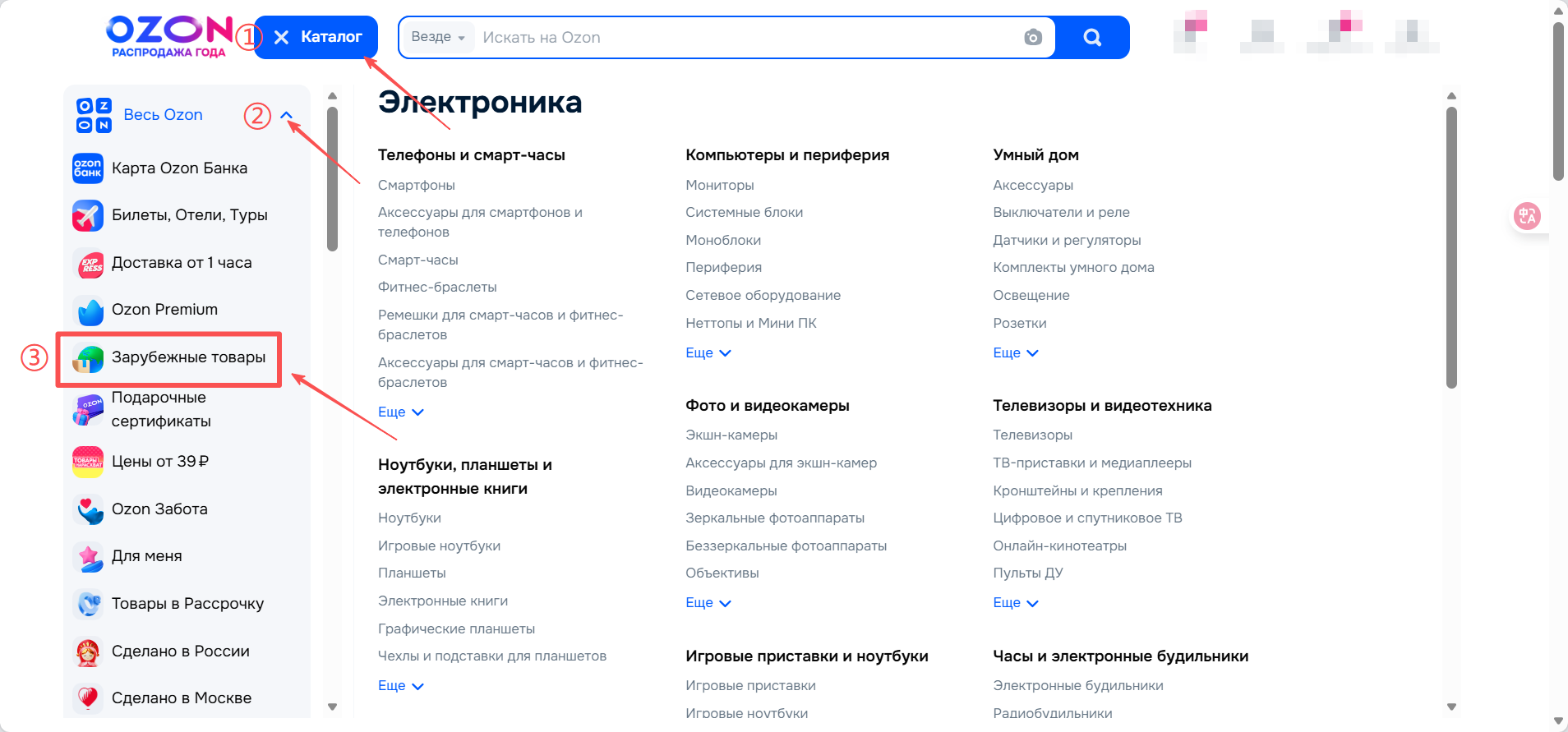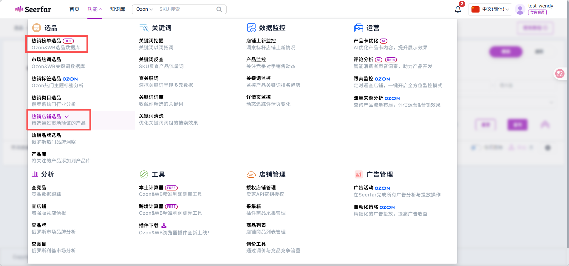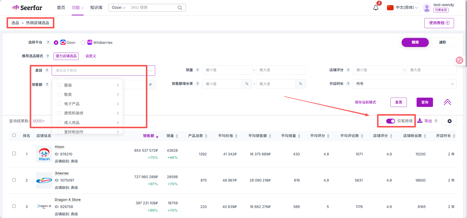 Ozon 前台找跨境商品,只需看左上角蓝色菜单里的“地图图标”;要系统、快速找到跨境热销品,用 Seerfar 一键筛跨境店铺最效率。