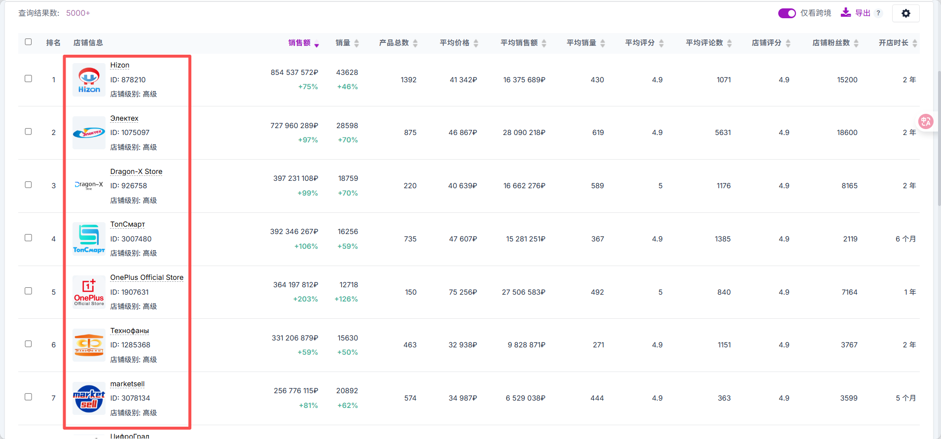 以下出现的,就是该类目所有跨境卖家,这些数据会一目了然地展示: