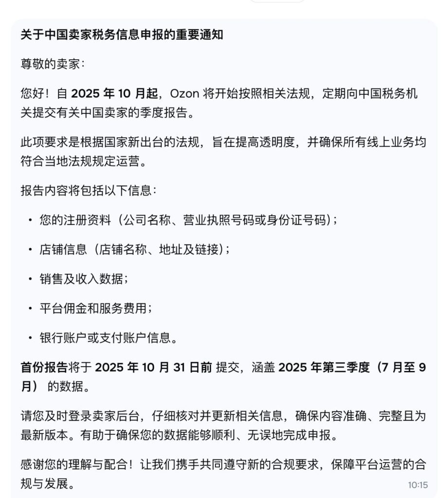 自2025年10月起,Ozon平台将根据中国最新法规要求,定期向中国税务机关提供中国卖家的季度税务报告。首份报告须于10月31日前完成提交,覆盖时段为2025年第三季度(7月至9月)的交易数据。