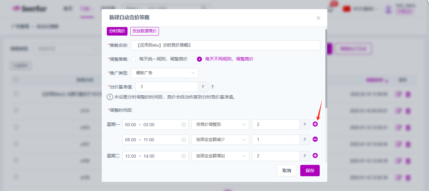 (注:在分时竞价策略生效时,在ozon后台修改了广告出价,修改后的出价不会作为策略下个调整点的分时出价基准值,系统只会以seerfar系统中的分时出价基准值作为策略下个调整点的广告出价基准,因此如果想调整分时出价基准值,请在seerfar系统中修改分时出价基准值。)