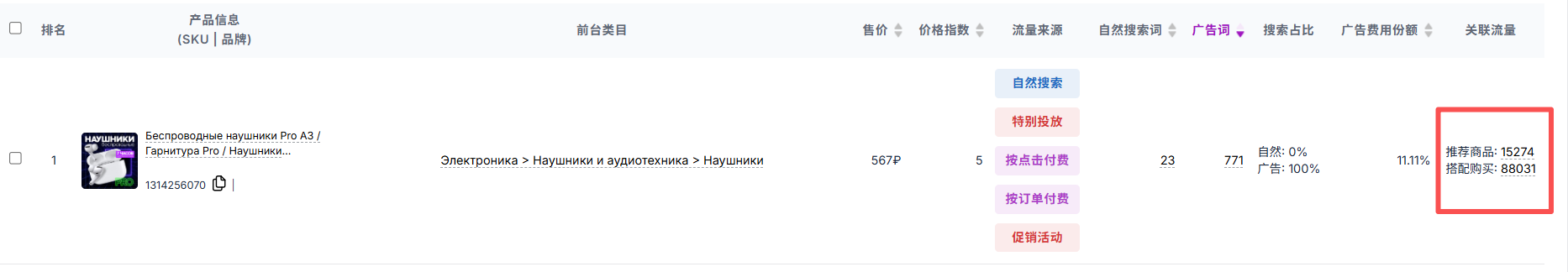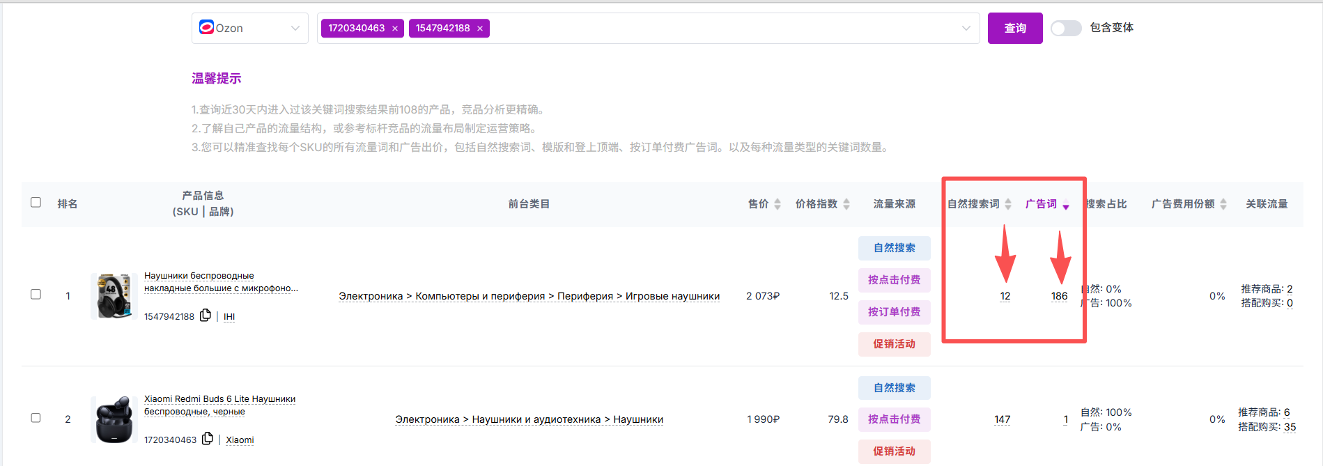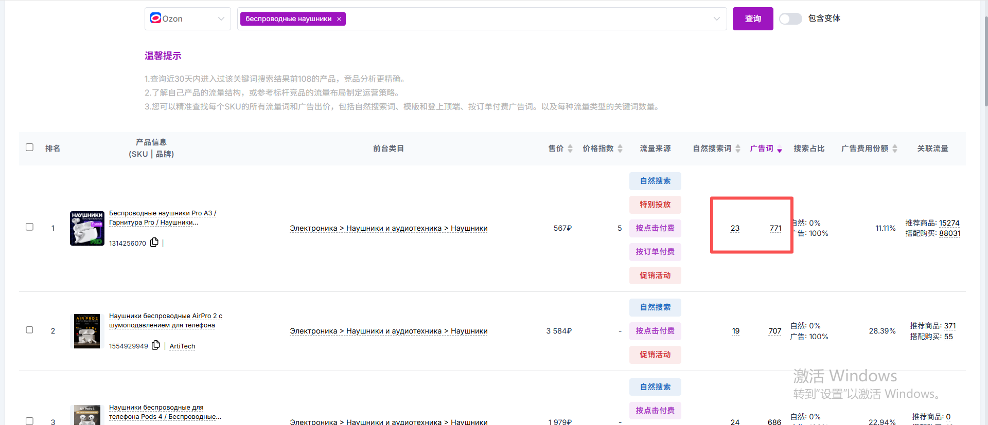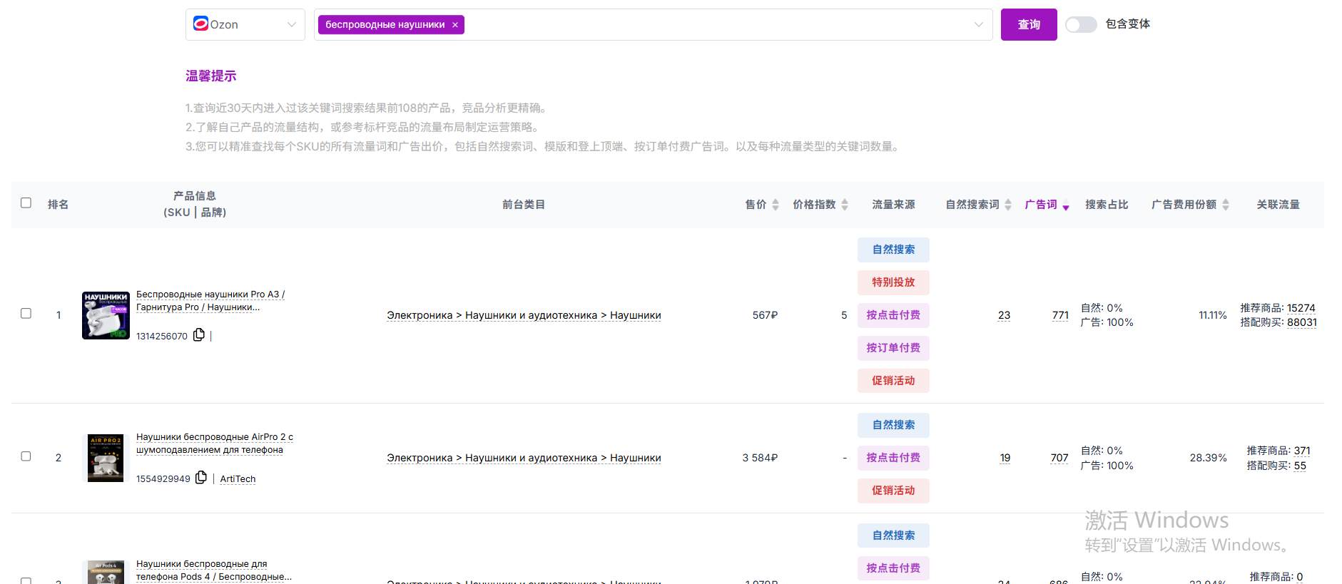 输入一个关键词,例如“беспроводные наушники(无线耳机)”,点击【查询】,系统会列出所有与该关键词关联的商品,包括其变体(多个 SKU)。