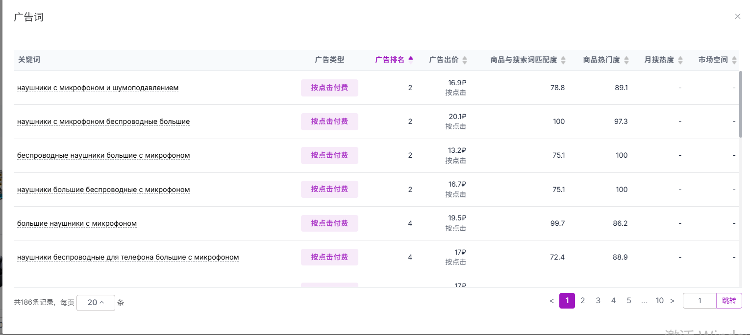 点击【数字】可查看具体的流量词,以及该关键词关联的广告类型(模版、登上顶端、促销等)、广告出价、广告排名等。