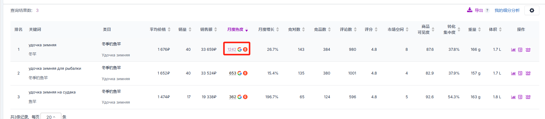 5.销量和销售额展示的是近30天的数据,我们在选择季节性产品时,还需要结合他们往年的数据来看。点击月搜热度,即可看到 удочка зимняя这个词在OZON/WB、谷歌俄罗斯和Yandex上近1年的搜索热度。